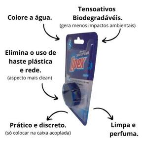 A pedra sanitária Lipex perfuma, limpa e desinfeta com ação bacteriostática, proporcionando um ambiente agradável no banheiro por até 4 semanas. Não mancha o vaso sanitário e a limpeza começa na caixa acoplada, alcançando as paredes do vaso, eliminando a necessidade de haste plástica e rede, o que confere um visual mais limpo ao banheiro. É produzida com tensoativos biodegradáveis, reduzindo impactos ambientais.