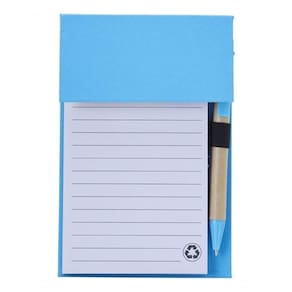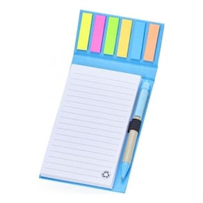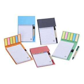 Bloco de anotações ecológico com caneta, feito em kraft com 6 blocos autoadesivos coloridos com aproximadamente 20 folhas e bloco com aproximadamente 100 folhas brancas com pauta. Possui porta caneta elástico e acompanha caneta de papelão e detalhes plásticos, carga esferográfica azul 1.0mm e acionamento por clique.