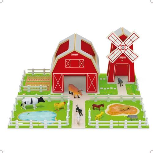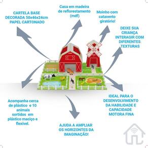a fazendinha casa e moinho é um brinquedo de construção da linha de play sets da junges. Elaborado a partir de peças em madeira de reflorestamento mdf com pintura atóxica e acabamentos em serigrafia, é composto por cartela base em papel cartonado 50x46cm, kit com 10 animais em plástico maciço e flexível, e cercas em plástico para decoração. Moinho com catavento giratório