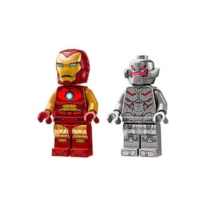 • O conjunto inclui 2 minifiguras: Homem de Ferro com um capacete flip-open e cabeça reversível mostrando expressões alternativas, e Ultron segurando um elemento de raio laser.
