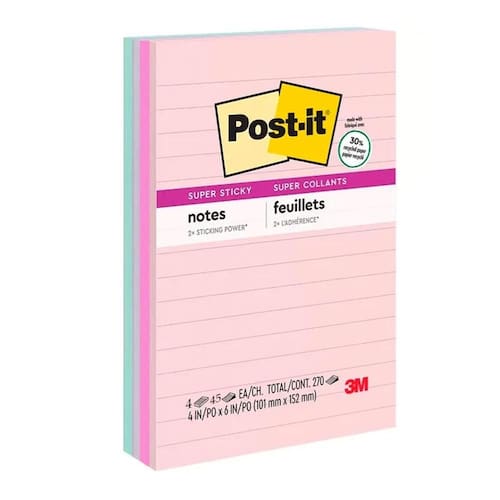 As notas super adesivas Post-it apresentam 2x maior poder de adesão. Com essas notas, você pode colar, descolar e colar novamente para mover lembretes e tarefas ao longo do dia. As notas pautadas são ótimas para listas de tarefas ou mensagens mais longas. Seu adesivo exclusivo cola, descola e cola novamente de forma confiável para que sua mensagem fique no lugar que você quiser. Mova suas notas com você ao longo do dia! Post-it super adesivo é reciclável. O papel de Post-it é proveniente de florestas certificadas.