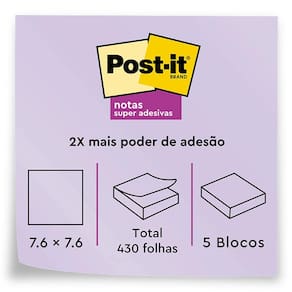 Suas folhas são reposicionáveis, ou seja, possuem Super Adesivo Post-it, que permite que sejam retirados e recolocados, sem danificar papéis ou outras superfícies, sem deixar resíduos do adesivo e sem perder a eficiência na fixação.