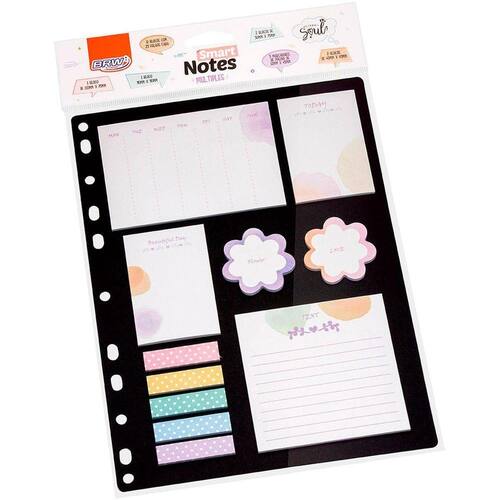Smart Notes são os blocos inteligentes da BRW Além de criativos, eles são auto-adesivos e garantem a organização em casa, na escola ou no escritório, podendo ser utilizados em agendas, cadernos, calendários e onde mais a sua imaginação permitir. O Smart Note Multiples Flor Poa é um kit 11 em 1, suavemente decorado com flores e poa, símbolos que estão sempre em alta, contendo: 6 blocos e 5 marcadores de página, incluindo um calendário semanal e um bloco de tarefas diárias.