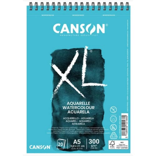 DescriçãoBloco de Papel Canson XL Aquarelle 300g A5 30 FolhasOs álbuns Canson® XL® Aquarela têm 30 folhas de papel de 300 g/m2 de qualidade para estudantes, ideais para diversas técnicas de pintura com aquarela e com água. Este papel não tem ácido e tem uma textura prensada a frio. A formulação da sua superfície assegura que é excelente para apagar em técnicas com água. 300 g/m2 Ideal para: aquarelas, guache e acrílicoÁlbum espiral: 14,8 x 21 cm 30 folhasTratamento resistente ao bolorConteúdo1 Bloco De Papel XL Aquarelle A5 300G 30 Folhas – Canson
