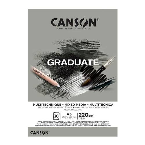Os blocos Canson Graduate Mixed Media (Multi-técnica) possuem um papel de cor cinzento, resistente e com dupla textura (grão fino e lisa). Graças às suas características, são ideais para sobresair as cores e criar profundidades nas obras: juntar branco ou preto, intensificar facilmente as sombras e os contrastes. São ideais para misturar técnicas e obter óptimos resultados.