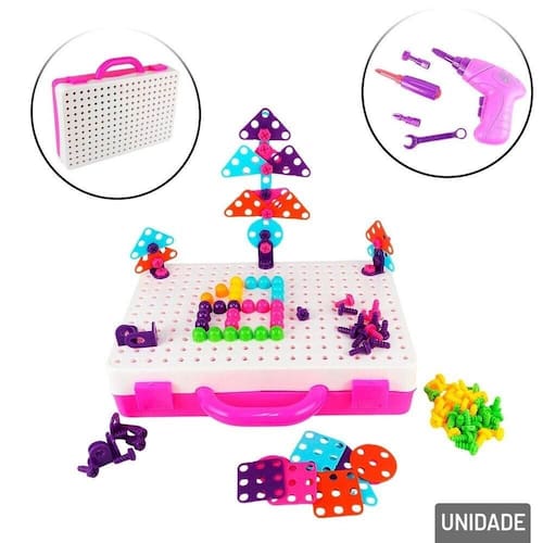 Bloco Monta e Desmonta Maleta e Parafusadeira Com o Bloco Monta e Desmonta Maleta com Parafusadeira Elétrica, a diversão e a criatividade não têm limites! Esse incrível conjunto vem com 211 peças, permitindo que as crianças criem diversas estruturas e formas usando a prática parafusadeira elétrica, que facilita a montagem e desmontagem das construções.\nAcompanha uma maleta organizadora, perfeita para guardar todas as peças e transportar a brincadeira para qualquer lugar. Ideal para estimular o raciocínio lógico, a coordenação motora e a criatividade, esse brinquedo educativo transforma a construção em uma experiência dinâmica e interativa.\nContém 211 Peças.\nUtiliza: 2x Pilha AA (Não Inclusas).\nEspecificações:\nMarca : ARK BRASIL\nTipo de material : Plástico\nCores ou Estampa : Rosa, Roxo, Branco\nDimensões do Produto : 23,5 X 30 X 6,5 CM\nDimensões da Embalagem : 24 X 31 X 7,5 CM\nPeso Bruto (Gramas) : 0.818