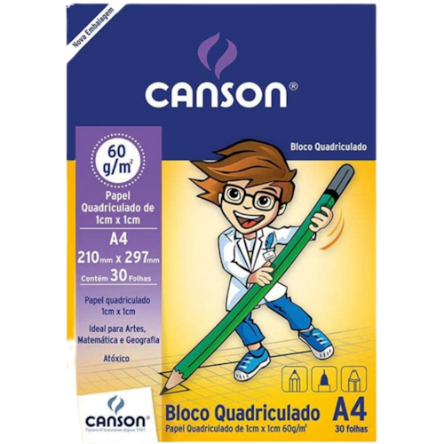 O Bloco Quadriculado Escolar Canson possui quadrados de 1cm x 1cm, indicado para crianças nas atividades de Educação Artística e Matemática.
