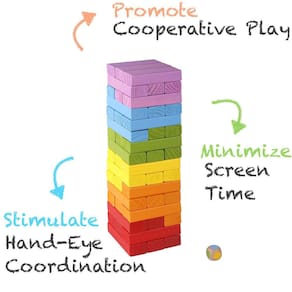 - Jogo de obstáculos perfeito para familiares e amigos! Promove a coordenação, a comunicação e a lógica entre as crianças. O conceito de brincar com a mão para remover blocos ajuda na coordenação olho-mão e no autocontrole.