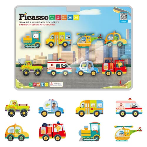 Blocos de construção magnéticos PicassoTiles, 8 peças, Metro City 8, figuras de ação magnetizadas de veículos, ímãs estruturais magnéticos , acessórios de azulejo, conjunto de brinquedos educativos STEAM, brinquedos educativos, a partir de 3 anos, PTA24
