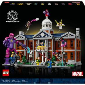 Marvel X-Men: The X-Mansion é um modelo detalhado da escola do Professor Xavier, com 3093 peças e 10 minifiguras icônicas Inclui ambientes clássicos como laboratório, biblioteca e Danger Room, além de uma figura montável do Sentinela