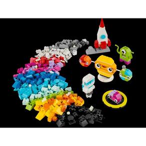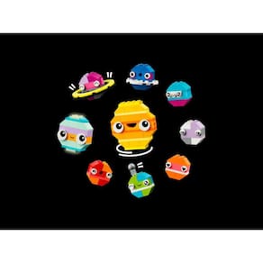 As crianças montam os tijolos coloridos para construir um foguete de brinquedo, um alienígena, um astronauta e um mini sistema solar incluindo Marte, a Terra, o Sol e Saturno com seus anéis Os modelos espaciais podem então ser personalizados usando cores, formas, olhos, expressões alternativas e um suporte que permite girar o modelo Existem até tijolos que brilham no escuro para visibilidade noturna