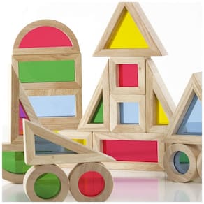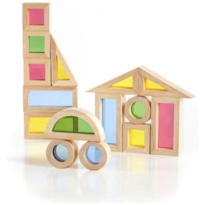 O conjunto Guidecraft Jr. Rainbow Blocks 20 peças é um kit de blocos de empilhamento para crianças de 2 a 7 anos, formado por molduras de madeira com janelas internas em acrílico transparente colorido. As peças têm aproximadamente um terço do tamanho dos unit blocks padrão, o que torna o manuseio mais confortável para mãos pequenas, mantendo proporções adequadas para construções estáveis em superfícies planas.?