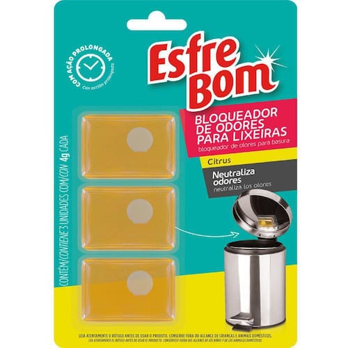 Bloqueador De Odores Para Lixeiras 3 Un Esfrebom BettaninO Bloqueador de Odores para Lixeiras EsfreBom é ideal para você que deseja neutralizar os maus odores vindo da sua lixeira.Eficaz na eliminação de maus odores, é indicado para ser utilizado no interior da lixeira.Com ação prolongada que neutraliza os odores, o bloqueador de odores possui agradável fragrância Citrus.Medidas aproximadas do produto- Comprimento: 19 cm- Altura: 1 cm- Largura: 13 cm- Peso: 100 g