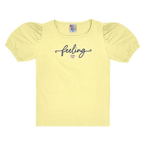 Lindos looks com apenas uma peça! Esta blusa é confeccionada em cotton leve na cor amarela, possuí estampa bordada em paetê com escrita “feeling” (sentimento). Sua pequena fashionista vai arrasar no passeio e no look, a diversão vai ser garantida durante o passeio.