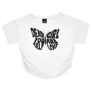 Para encontrar as amigas ou fazer um passeio no shopping, toda garota gosta de estar bem vestida e confortável para a ocasião. Confeccionada em meia malha, nossa blusa butterfly na cor branca conta com aplique metalizado em forma de uma borboleta formando a frase “dear girl, you are self love” (querida garota você é amor próprio). A peça perfeita para compor diversos looks é essa!