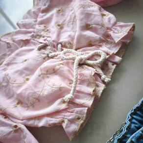 Franzidos e babados nas barras e nos decotes, conferindo um toque feminino e fluido. Amarração frontal com cordões, criando um detalhe ajustável e charmoso. Bordados florais ou em relevo distribuídos pela peça, adicionando textura e um visual artesanal.
