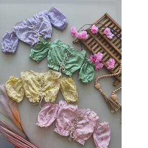 Franzidos e babados nas barras e nos decotes, conferindo um toque feminino e fluido. Amarração frontal com cordões, criando um detalhe ajustável e charmoso. Bordados florais ou em relevo distribuídos pela peça, adicionando textura e um visual artesanal.