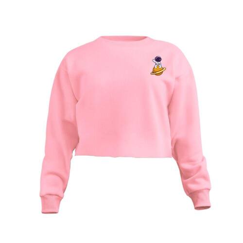 Blusa Cropped Moletom Astronauta Saturno Feminino Personalizado com Cintura Descosturada - Rosa - M