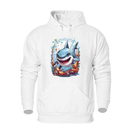 Blusa de Moletom Com Capuz Bolso Canguru Flanelada Quente Inverno Estampa Tubarão - Branco - GG