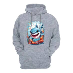 Blusa de Moletom Plus Size Bolso Canguru Com Capuz Flanelada Quente Inverno Estampa Tubarão - Cinza - G2