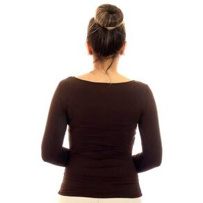 Blusa feminina manga longa decote canoa, marrom, cor clássica, em tecido LIGHT CO2 biodegradável (fio AMNI SOUL ECO, o primeiro fio de nylon biodegradável do mundo), com fator de proteção solar 50FPS+ UVA e UVB.
