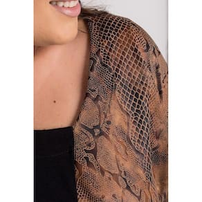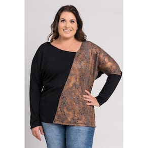 Blusa feminina elaborada em visco. Peça com boa elasticidade, leve, macia. Possui detalhe de tecido suede estampado em animal print, na parte da frente e parte da manga morcego. Aquela peça cheia de estilo na hora de compor looks seja para aquele passeio, trabalho, etc. Use-a como destaque do look ou sobrepostas, com seu jeans favorito, aquele blazer, de dia ou a noite use a imaginação e arraze!