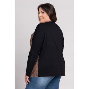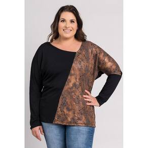 Blusa feminina elaborada em visco. Peça com boa elasticidade, leve, macia. Possui detalhe de tecido suede estampado em animal print, na parte da frente e parte da manga morcego. Aquela peça cheia de estilo na hora de compor looks seja para aquele passeio, trabalho, etc. Use-a como destaque do look ou sobrepostas, com seu jeans favorito, aquele blazer, de dia ou a noite use a imaginação e arraze!