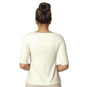 Blusa feminina meia manga decote canoa evasê, cor palha clássica, em tecido LIGHT CO2 biodegradável (fio AMNI SOUL ECO, o primeiro fio de nylon biodegradável do mundo), com fator de proteção solar 50FPS+ UVA e UVB.