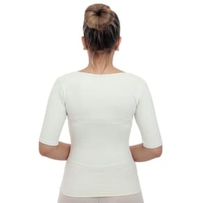 Blusa feminina meia manga decote redondo, cor palha clássica, em tecido LIGHT CO2 biodegradável (fio AMNI SOUL ECO, o primeiro fio de nylon biodegradável do mundo), com fator de proteção solar 50FPS+ UVA e UVB.