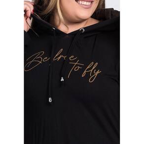 Blusa feminina plus size elaborada em visco. Possui estampa na parte da frente "Be free to fly" (Seja livre para voar), capuz com cordao e detalhe interno em material sintético animal print, que também está presente em parte das mangas. Com toque macio, leve e boa elasticidade, nos dias frios tenha aquela peça para usar como destaque do look ou sobreposta e que será a queiridinha de seu guarda roupas, pois toda mulher precisa ter uma peça coringa para o dia a dia e esta sem dúvidas é aquela "básica nada básica"