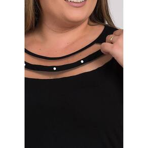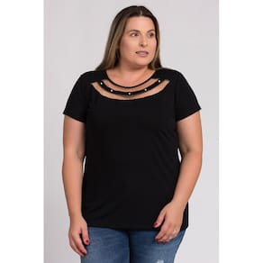 Blusa feminina plus size elaborada em visco. Possui transparência abaixo do decote/gola, aplique de pérolas que dão um charme e estilo na a peça, bem como na composição de seus looks! Peça leve, com toque macio, boa elasticidade, uma básica nada básica. Para o dia ou a noite, para passear, curtir aquele dia de folga ou trabalhar, use a imaginação e abuse da versatilidade desta peça.