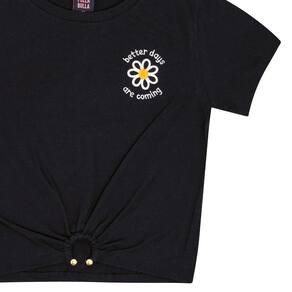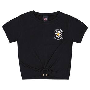 Blusa tendência e indispensável no guarda-roupa das fashionistas. Confeccionada em meia malha na cor preta, possuí leveza para aproveitar cada momento, aplique bordado de flor e detalhe "piercing" próximo a barra deixando a peça ainda mais fashionista.