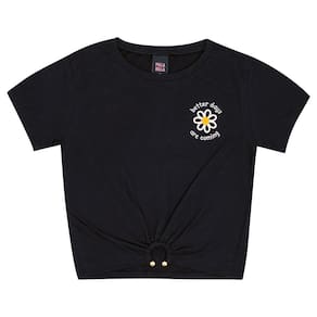 Blusa tendência e indispensável no guarda-roupa das fashionistas. Confeccionada em meia malha na cor preta, possuí leveza para aproveitar cada momento, aplique bordado de flor e detalhe "piercing" próximo a barra deixando a peça ainda mais fashionista.