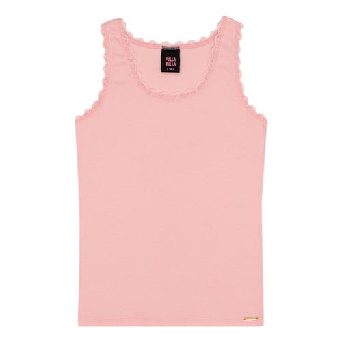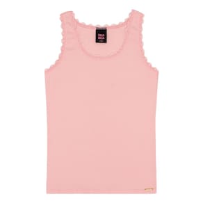 Componha looks básicos ou despojados com esta blusa. Confeccionada em ribana com elastano leve na cor rosê, a blusa no modelo regata possuí detalhe de renda nas alças e gola.