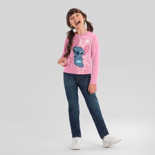 Deixe a imaginação da sua pequena voar para fora deste planeta com a blusa infantil para meninas do Stitch da Brandili! Confeccionada em malha macia com manga longa e gola redonda, ela oferece o máximo de conforto para que sua pequena possa viver suas próprias aventuras alienígenas. A estampa colorida do Stitch, acompanhada de escritas e detalhes em glitter, traz um brilho extra, deixando a peça ainda mais encantadora e cheia de personalidade. Com sua energia única, vai fazer com que sua pequena se destaque com muito estilo, perfeita para momentos de diversão. Essa blusa é ideal para combinar com jeans, saias ou leggings, criando looks que são um verdadeiro sucesso. Aposte nessa peça para o guarda-roupa de sua pequena