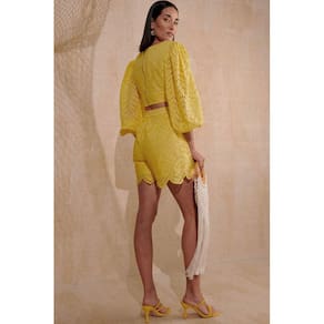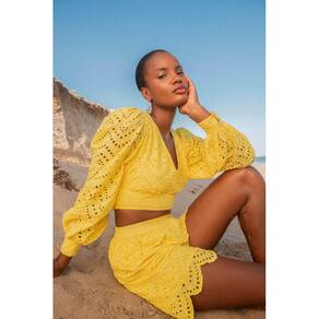 Blusa cropped com decote em V. Manga longa com franzido . Zíper de metal na costura das costas. Em laise com forro.