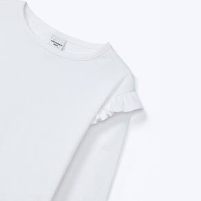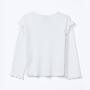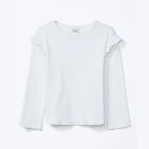 Essa blusa menina toddler de manga longa com babados apresenta uma modelagem regular, levemente ajustada ao corpo, e apresenta babados aplicados na cava das mangas. Feita de malha de ribana lisa, essa peça combina conforto com um toque de estilo, sendo versátil o suficiente para diversas ocasiões.