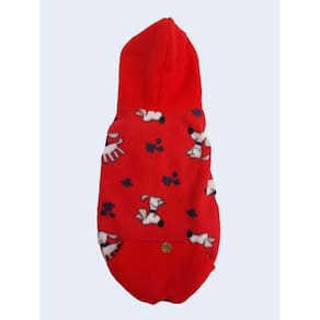 Blusa Pet vermelha cachorrinhos com capuz dupla face tam. G Roupa Pet, soft felpado sem mangas, para uso de cachorros e gatos, tamanho G Medidas: Pescoço: 34 cm; Torax: 50 cm; Comprimento: 42 cm.