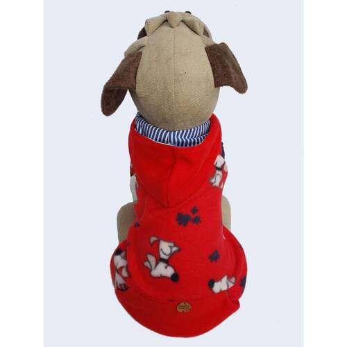 Blusa Pet vermelha cachorrinhos com capuz dupla face tam. M Roupa Pet, soft felpado sem mangas, para uso de cachorros e gatos, tamanho M Medidas: Pescoço: 32 cm; Torax: 44 cm; Comprimento: 35 cm;