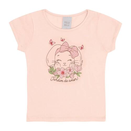Blusinha ideal para os passeios mais divertidos da estação! Confeccionada em tecido meia malha a blusinha possuí estampa frontal de coelhinha na cor rosa pó com flores e escrita "Jardim do amor", ótimo para combinar com short, saia ou legging e aproveitar o dia com a priminha.