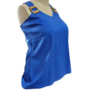 Descrição: Possui boa respirabilidade, semelhante aos tecidos de algodão. É de fácil tingimento e aceita cores vivas, tem ótimo custo x benefício. Secagem rápida. Não amassa com facilidade, com o design na gola em V, e na alça regata com um detalhe, look para o dia-a dia e casual