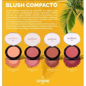 - Trazendo sempre o que o consumidor precisa, com muita praticidade, variedade e qualidade, a Catharine Hill está com mais um lançamento chegando. Dessa vez, complementando ainda mais a parte da pele na make, a Catharine Hill vem com o novo Blush. - Com a missão de dar uma corada, realçando as maçãs e garantindo uma cor de pele saudável para o rosto, o novo Blush da Catharine Hill veio com uma textura única. Com alta durabilidade, super pigmentado, partículas ultrafinas e acabamento luminoso e seco, o Blush da Catharine Hill veio em 4 cores pra atender a todos os tipos de pele. - Como usar: Aplicar sobre as maçãs do rosto com o auxílio de um pincel até obter o efeito desejado. Benefícios: - Solto e ultrafino - Alta pigmentação - Acabamento luminoso - 4 tons - Durabilidade - Peso: 6g
