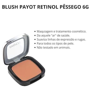 Blush Payot Pêssego O Blush Retinol é maquiagem e tratamento cosmético em um só produto. Com a presença do ativo retinol vegetal, auxilia na suavização de linhas de expressão e rugas, proporcionando um efeito de pele saudável e suave.Com pigmentos micronizados e textura ultrafina que esfuma facilmente, possui boa fixação e proporciona pigmentação na medida certa desde a primeira aplicação. Para todos os tipos de pele. Retinol Vegetal - extrato obtido da planta Bidens pilosa. Atua de forma semelhante aos retinóis sintéticos..Benefícios: -maquiagem e tratamento cosmético.-ativos retinol vegetal.-da aquele ar de saúde.-suavização de linhas de expressão e rugas.-para todos os tipos de pele.-não testado em animais..Modo de Uso: Aplicar com pincel,as maçãs do rosto até obter o resultado desejado..Composição: Talc,zea mays starch,dimethicone,zinc stearate,pentaerythrityl tetraisostearate,octyldodecyl stearoyl stearate,caprylyl glycol,phenoxyethanol,isononyl isononanoate,hexylne glycol,elaeis guineensis oil,gossypium herbaceum seed oil,bidens pilosa extract,linum usitassimum seed oil,tocopherol.Pode conter:tin oxide,calcium aliminum borosilicate,silica,mica,ci77891,ci77491,ci77492,ci77499,ci15850,ci42090.