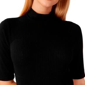 Detalhes: Gola alta, que alonga a silhueta.
