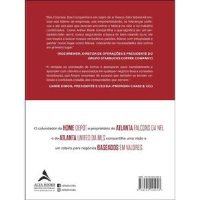 Arthur M. Blank acredita que, para boas empresas, propósito e lucro devem andar de mãos dadas. Ao lado de Bernie Marcus, Blank, construiu a Home Depot, a principal varejista de reforma de casas do mundo. E mesmo enquanto abria uma nova loja a cada 42 horas, eles nunca perderam de vista seu compromisso de cuidar de sua gente e suas comunidades. Por isso, em 2001, a Home Depot foi eleita a empresa mais socialmente responsável da América. Blank deixou a Home Depot naquele mesmo ano, com uma pergunta complicada: Os valores e a cultura que tornaram aquela empresa ótima poderiam ser repetidos? Boa Empresa, Boa companhia leva os leitores para dentro da história de como ele fez isso em torno de uma equipe da NFL com dificuldades, reiniciando uma cadeia varejista quase falida, construindo um novo estádio, revitalizando um bairro em ruínas, lançando um clube de futebol a partir de uma start-up e mais. “Quando boas empresas colocam o bem-estar de seus clientes, associados e comunidades em primeiro lugar, o sucesso financeiro a acompanha,” escreve Blank. “Os empresários e líderes de negócios de hoje e amanhã têm uma oportunidade extraordinária: provar que, através de valores sustentáveis, nós podemos criar valor para a empresa, para o cliente e para a comunidade.”