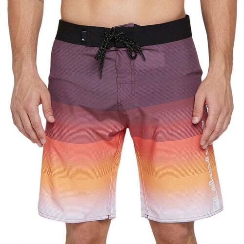 Boardshorts regular, tecido de poliéster com elastano estampado, tecido com 4Way, elasticidade para 4 lados, cós duplo do contrastante próprio tecido, cordão chato especial, bolso chapado traseiro com lapela e fita dupla aderente. Etiqueta aplicada na perna esquerda, tecido telado no interno do bolso com aplicação de elástico para chaves e etiquetas personalizadas.