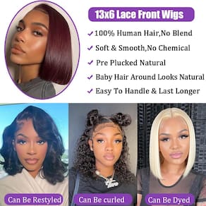 -?Perucas frontais Bob Lace 99j Cabelo humano?: peruca frontal de renda transparente HD 13X6, muito macia e invisível. Combina perfeitamente com sua pele. Linha de cabelo natural pré-arrancada com cabelo de bebê faz com que pareça mais natural. O efeito de desgaste é o mesmo do seu próprio cabelo natural. Isso lhe trará uma aparência perfeita para sua vida diária, encontros e festas temáticas, e o tornará mais confiante e charmoso.