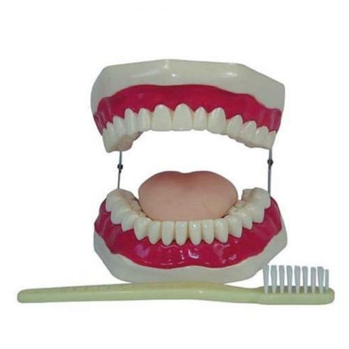 Este modelo mostram as metades superior e inferior de uma dentição adulta, possui articulação entre as mandíbulas e língua. Ideal para ensinar técnicas corretas de higiene bucal, usando uma escova gigante que acompanha o modelo/ É possível observar nesse modelo: dentição adulta completa, língua, gengiva e mandíbula