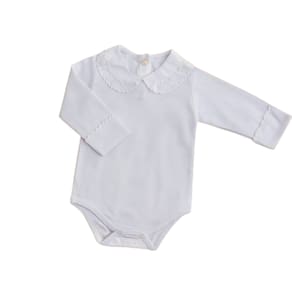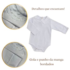 Body Branco Infantil Bebê Manga Longa Punho e Gola Bordada referencia BB79. Perfeito para combinar com as saídas de maternidade! Eles completam os primeiros looks dos bebês, garantindo a eternização desse momento tão importante com muito estilo e conforto. O body com gola é confeccionado em 100% algodão. Possui abertura entre as pernas e na parte de trás da gola para facilitar a passagem da cabeça do bebê sem machucar. Os tecidos de extrema qualidade e acabamentos impecáveis fazem com que o body não precise ser utilizados exclusivamente por baixo do macacão, mas também como uma roupinha super confortável e elegante. Uma peça que proporciona extremo conforto pois mantém a fralda no lugar e protege a barriguinha do bebê.Ele possui Maciez ao toque, garantindo o conforto. Mantém a temperatura do bebê sem super aquecer por isso é indicado para todas as estações do ano.