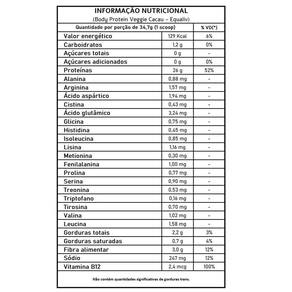 Descrição: Body protein veggie cacau, é um blend proteico vegano feito com as proteínas do arroz e ervilha com o delicioso sabor de cacau.